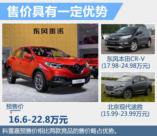 目前,在国内的紧凑型SUV细分市场当中,东风本田CR-V的厂商指导售价为17.98-24.98万元;北京现代全新途胜的厂商指导售价为15.99-23.99万元。根据东风雷诺官方公布的消息,科雷嘉2.0L车型的预售价格为16.6-22.8万元。通过对比不难看出,科雷嘉2.0L车型的入门预售价格处于同级别的CR-V与全新途胜之间,最高配车型的预售价则比CR-V与全新途胜均低1万元以上。而年内将上市的科雷嘉1.2T车型,由于换搭小排量发动机,新车价格将有望进入15万元区间,价格更具有优势。(网通社 2016年2月15日 北京报道)